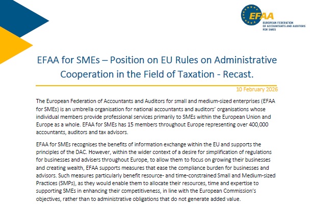 EFAA for SMEs highlights the growing administrative burden created by successive DAC amendments and their disproportionate impact on SMPs. It calls for simplified, proportionate reporting obligations and clearer responsibilities for taxpayers. EFAA for SMEs also urges full recognition of professional secrecy for accountants to ensure a level playing field with other professions.